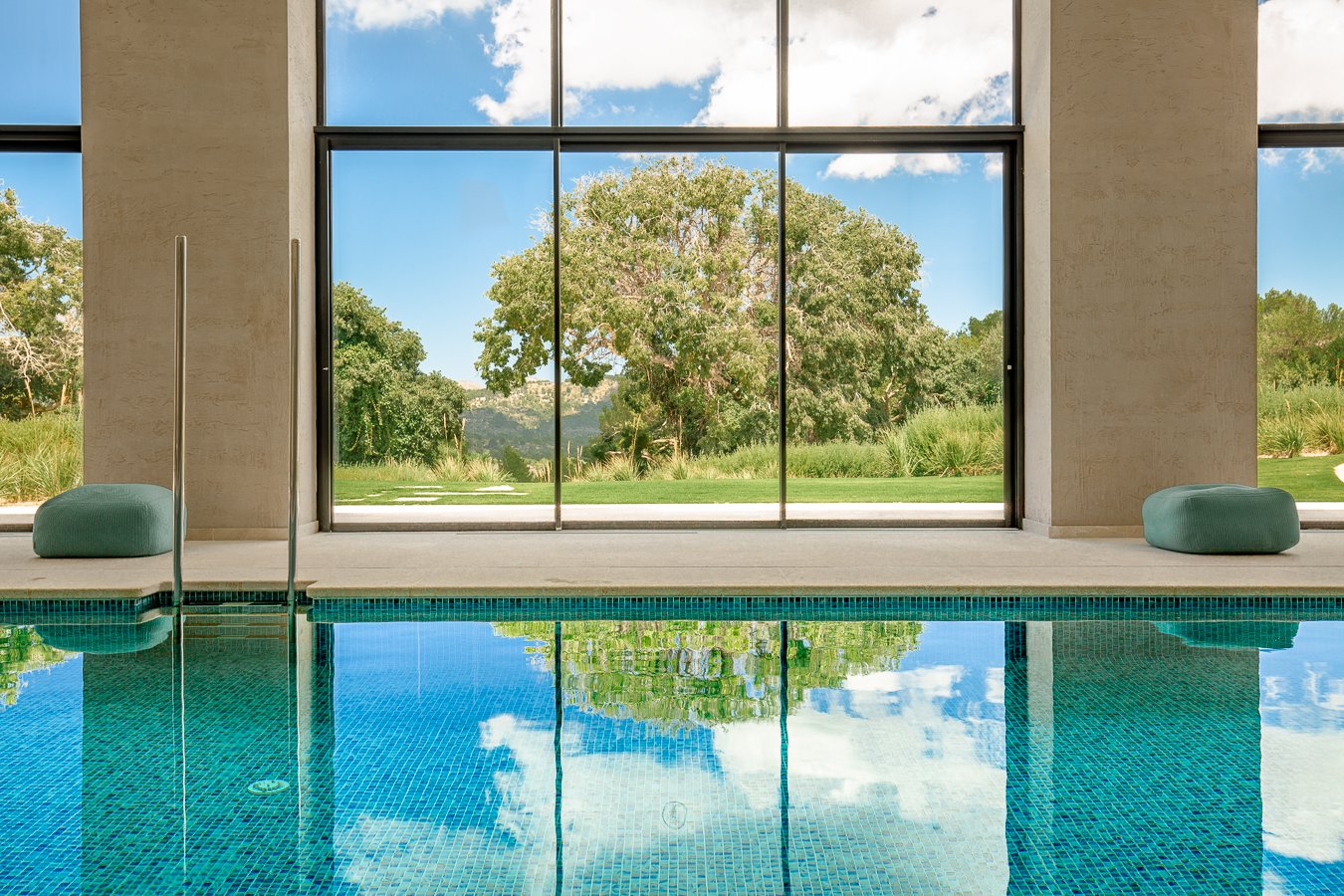 Innenaufnahme eines modernen Spa- oder Poolbereichs mit Liegestühlen, großen Fenstern, die einen Blick ins Grüne bieten, und einem kleinen Schwimmbecken.