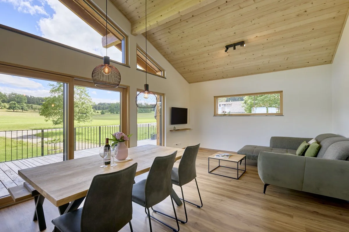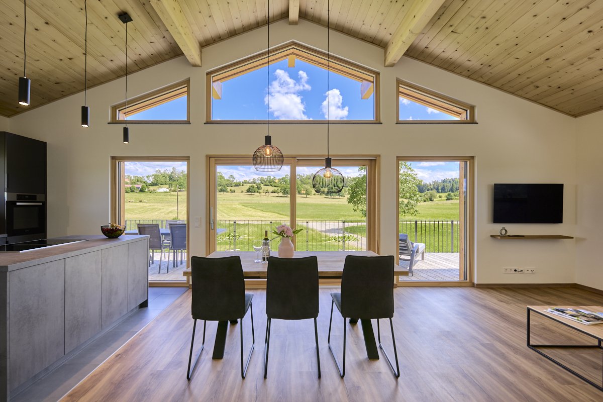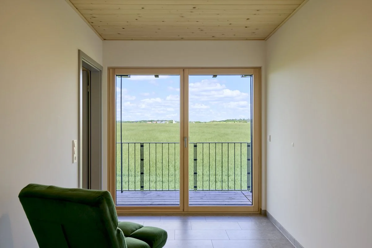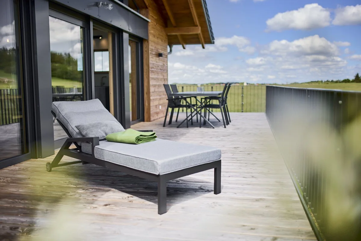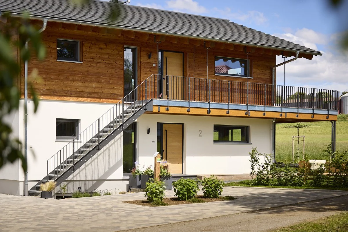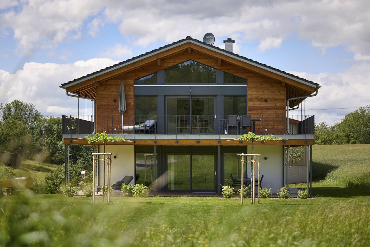Ein modernes Haus mit Holzfassade und großer Balkon, umgeben von grünen Wiesen und Bäumen, im Hintergrund ein bewölkter Himmel.