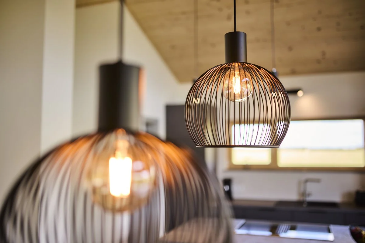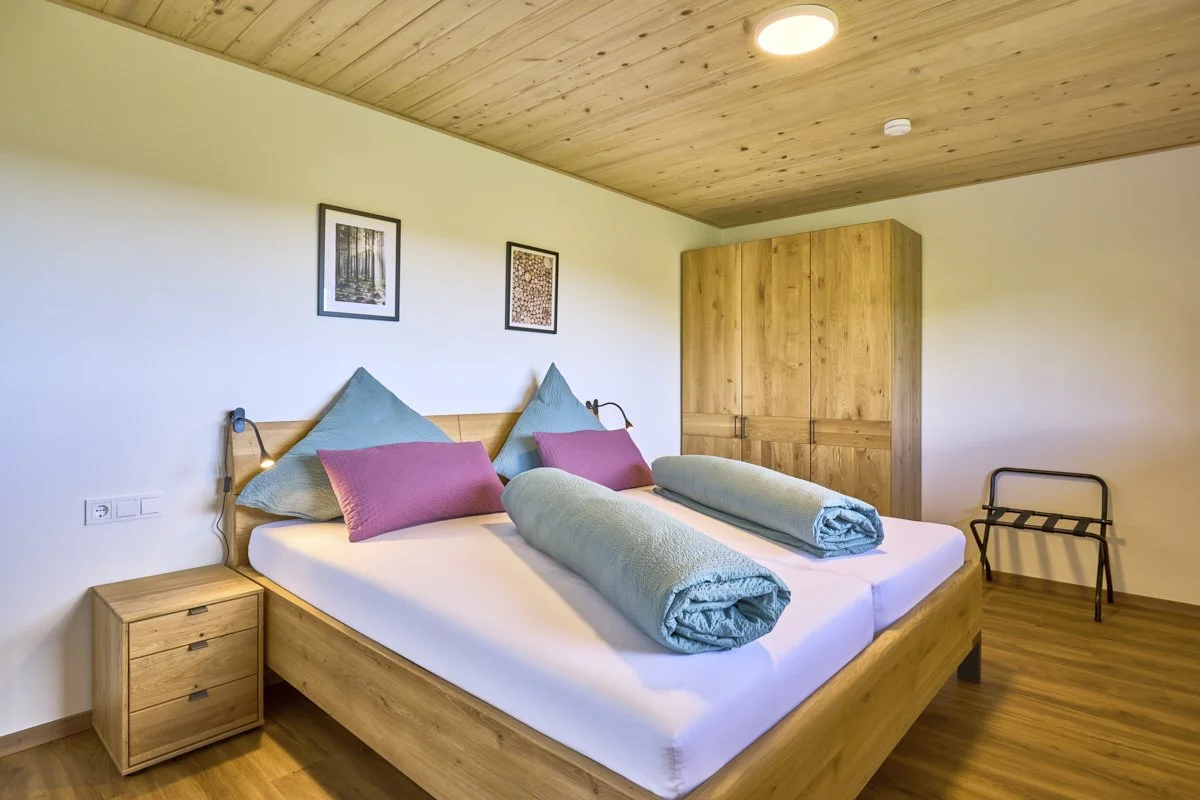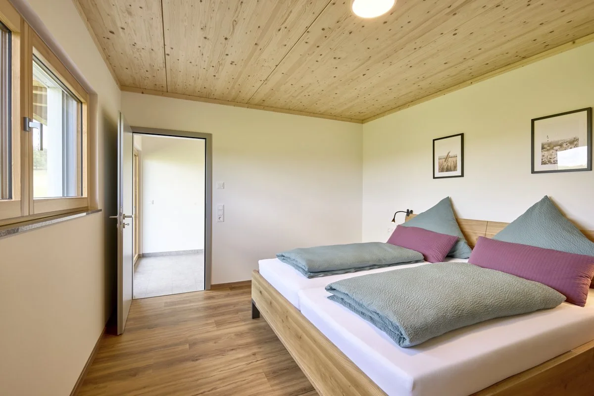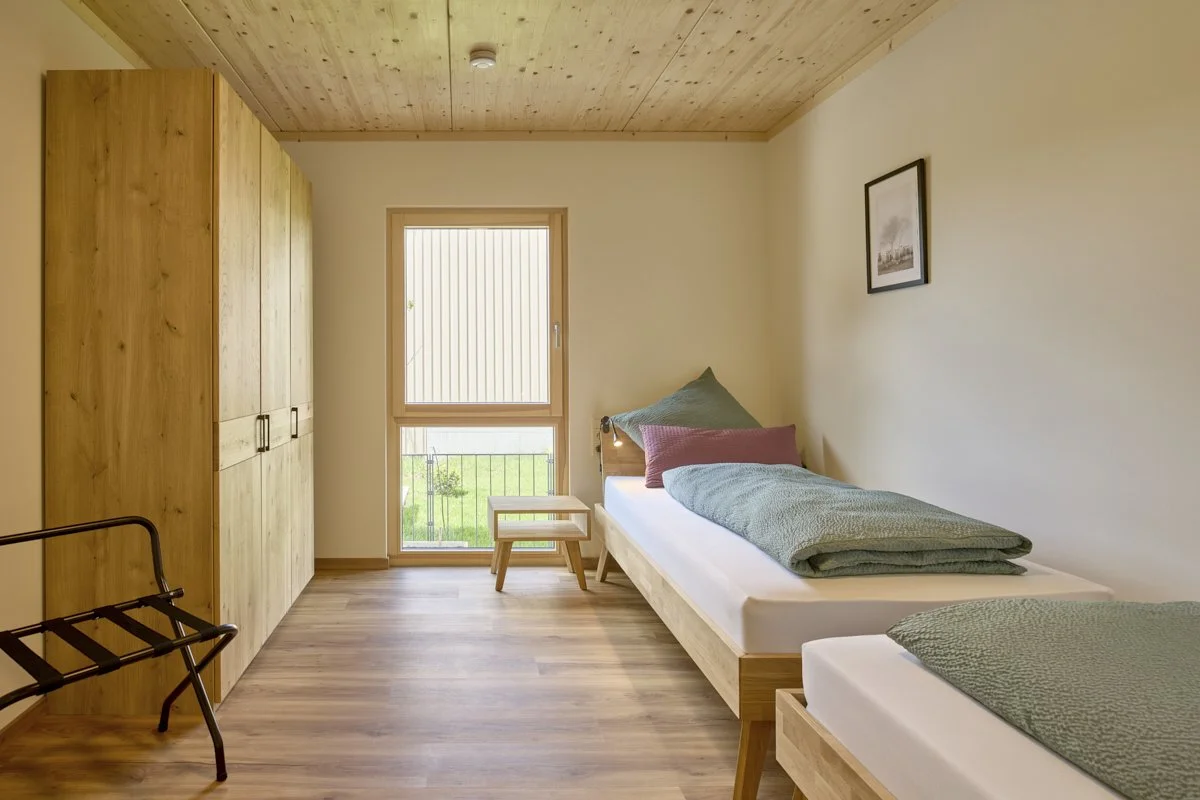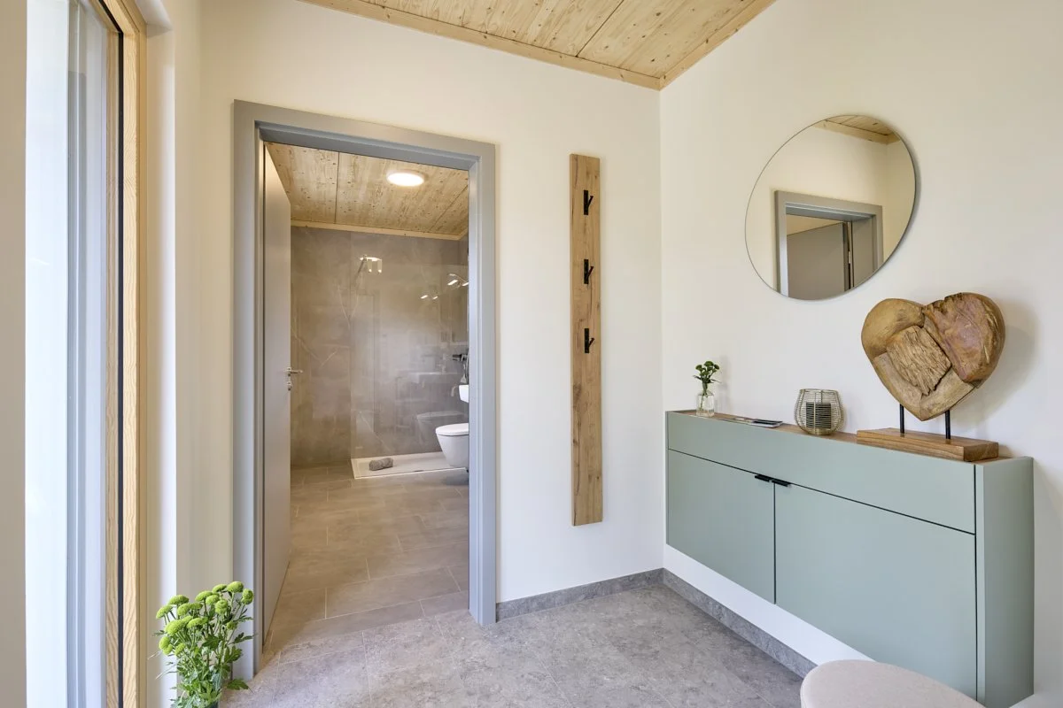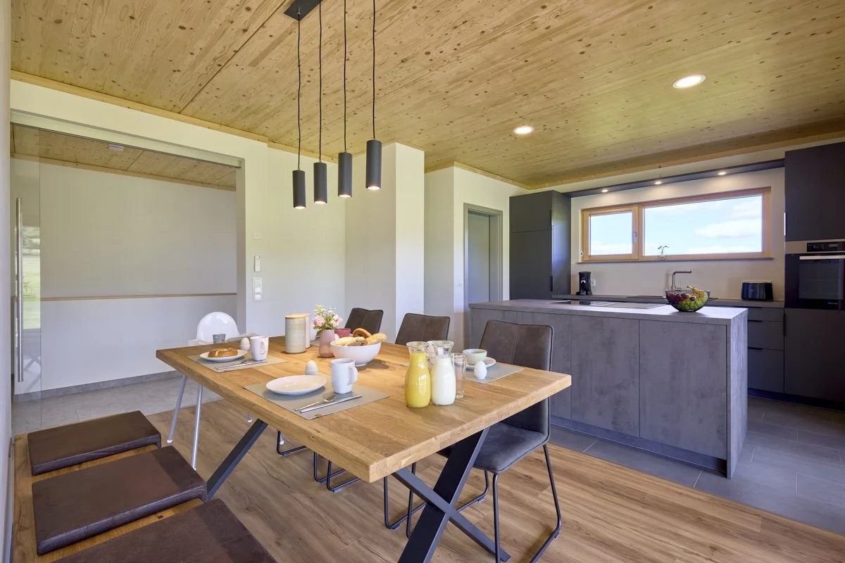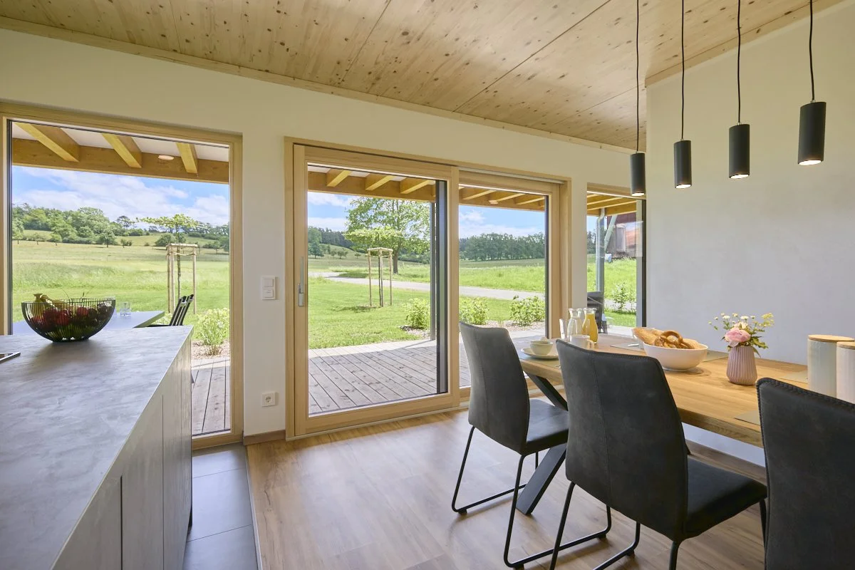 Ein modernes Haus mit Holzfassade und großer Balkon, umgeben von grünen Wiesen und Bäumen, im Hintergrund ein bewölkter Himmel.