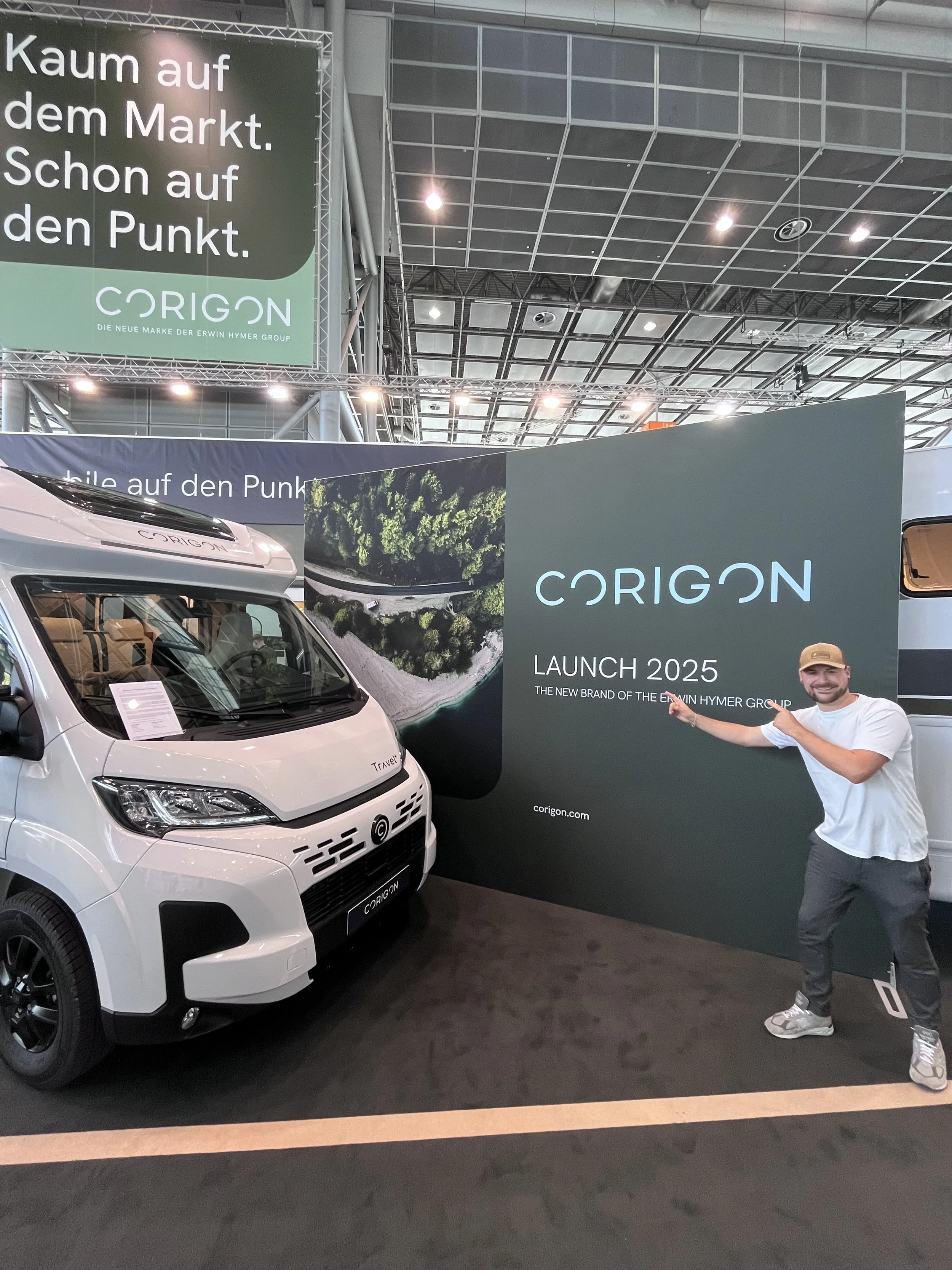 Mann zeigt auf eine Ciorigon-Van auf einer Messe, im Hintergrund ein großes Werbeschild mit dem Text "LAUNCH 2025" und "DIE NEUE MARKE DER ERWIN HYMER GROUP"